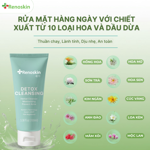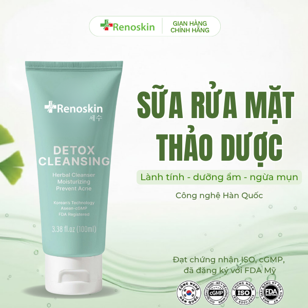 Sữa rửa mặt Detox Cleansing Renoskin  với chiết suất từ 10 loại hoa & thảo mộc cùng công nghệ Hàn Quốc, sữa rửa mặt thảo dược Renoskin giúp làm sạch sâu bụi bẩn và dầu thừa, ngăn ngừa mụn từ gốc hiệu quả. Đồng thời giúp dưỡng ẩm mềm mịn cho da, an toàn cho da nhạy cảm. Phù hợp để ngừa mụn tuổi dậy thì và dùng lâu dài.
