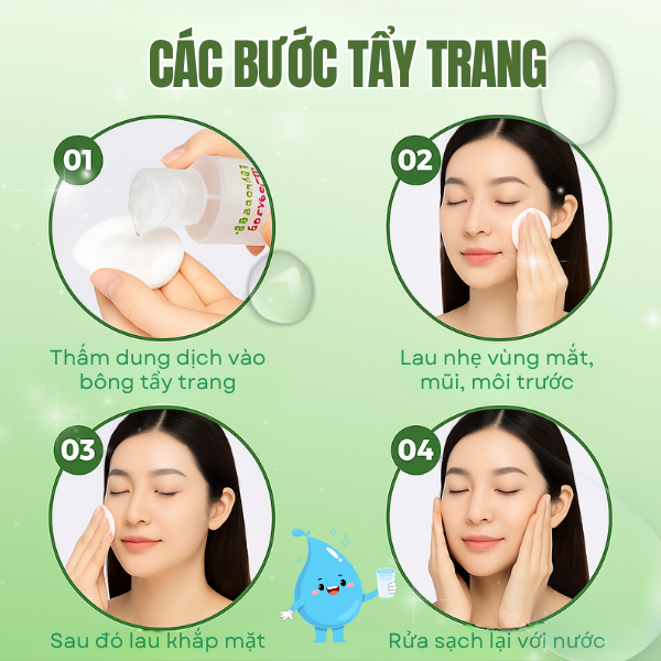 Cho một lượng sản phẩm vừa đủ ra bông tẩy trang, massage nhẹ nhàng lên mặt để làm sạch lớp makeup cũng như bụi bẩn và dầu thừa sau đó rửa lại với nước. Kết hợp với sửa rửa mặt để đạt hiệu quả.