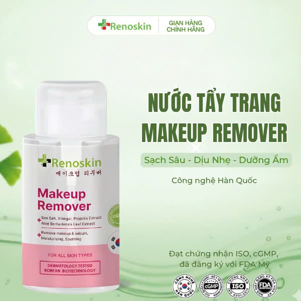 Nước tẩy trang Makeup Remover Renoskin giúp làm sạch lớp trang điểm, bụi bẩn và bã nhờn. Với chiết xuất Keo Ong, Nước biển sâu, Nha Đam và Giấm Táo, giúp loại bỏ tạp chất mà còn dưỡng ẩm, làm dịu da, ngăn ngừa mụn.
