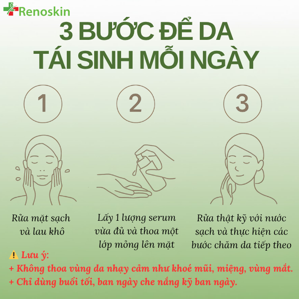* Chỉ dùng buổi tối. Che nắng kỹ ban ngày với khăn trùm và kem Chống năng Sun White Renoskin hoặc BB Cream.